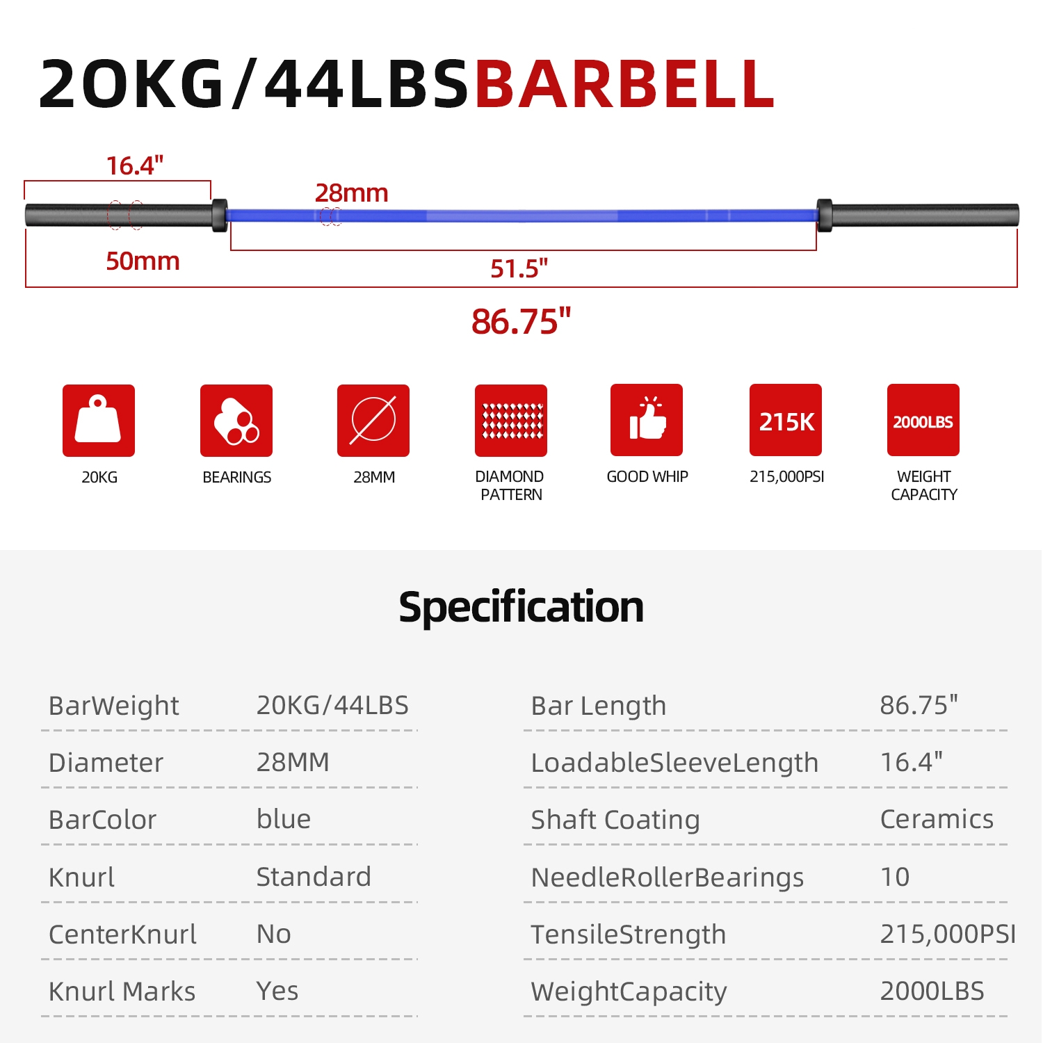 • Superior Strength and Finish:  This bar comes with Cerakote shaft and  sleeves. The bar is 20KG, 86.6″ long, it has 28mm shaft diameter, good whip, made of high-grade alloy steel and snap ring construction, giving it a 215K PSI tensile strength rating and a max load of 2000lbs, which allows you to do heavy training sessions without any trouble.